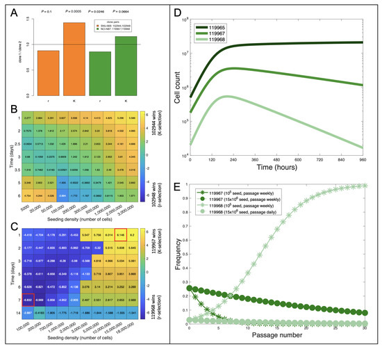 While the growth conditions for SNU-668 can be modulated to favor the r-selected clone, by the time it exceeds the K-selected clone, its frequency in the cell line is less than 0.001%. In this case, the r/K trade-off between the two clones has little practical relevance, because other clones in the cell line take over the population faster than the two clones can outcompete each other (Figure 2B). In contrast, the r/K trade-off identified in NCI-N87 did have practical relevance, with most cell culture schedules resulting in populations where at least one of the two clones maintains high cell representation (>5%; Figure 2C).