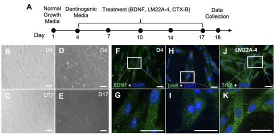Expression of BDNF and its receptor TrkB in DPSCs. (A) Schematic diagram of the experiment during 17 days of the odontoblastic differentiation of DPSCs. (B) An image using a differential interference contrast (DIC) microscope on day 4. (C) A DIC image from day 17 is shown after differentiation in dentinogenic media. (D) Phase contrast microscopy of the DPSCs on day 4. (E) The morphology of the DPSCs after 17 days of odontogenic differentiation; imaged obtained via phase contrast microscopy. (F) Immunofluorescent image of BDNF in DPSCs on day 4. (H) Immunofluorescent image of TrkB receptors in DPSCs on day 4. (J) Immunofluorescent image of TrkB receptors in DPSCs after LM22A-4 treatment. Figure (G,I,K) are magnified images of Figure (F,H,J) (Scale bars: 50 μm).