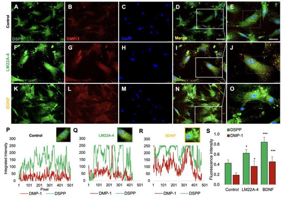 The expression of odontogenic markers DSPP and DMP-1 treated with LM22A-4 and BDNF proteins during DPSCs’ odontoblastic differentiation. (A) Immunofluorescent images of anti-DSPP (green) and (B) anti-DMP1 (red) expression during 17 days of DPSC differentiation (control); (C) DAPI staining after 17 days of DPSC differentiation. (D) Merged image of (A–C) to find co-localization of DSPP and DMP-1 in the cytoplasm of DPSCs. (E) Magnified image from the white box of (D). (F) Immunofluorescent images of anti-DSPP (green) and (G) anti-DMP1 (red) expression with the treatment of LM22A-4 on day 17. (H) DAPI staining. (I) Merged image of (F,G,H). (J) Magnified image from the white box of (I). (K) Immunofluorescent images of anti-DSPP (green) and (L) anti-DMP1 (red) expression with the treatment of BDNF on day 17. (M) DAPI staining. (N) Merged image of (K,L,M). (O) Magnified image from the white box of (N). Scale bar of (D,I,N): 50 μm. Scale bar (E,J,O): 25 μm). (P,Q,R) Integrated intensity of captured single cell from the dotted box (E,J,O). (S) Fluorescent intensity analysis of DSPP and DMP-1. * p < 0.05, and *** p < 0.001 vs. control.