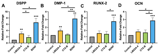 The mRNA expression of odontoblastic DPSCs treated with a TrkB agonist and antagonist. (A–D) The mRNA expression of odontogenic differentiation markers (DSPP, DMP1, RUNX-2, and OCN) during the differentiation of DPSCs with the treatment of LM22A-4, CTX-B, and BDNF. * p < 0.05, ** p < 0.01, and *** p < 0.001 vs. control.