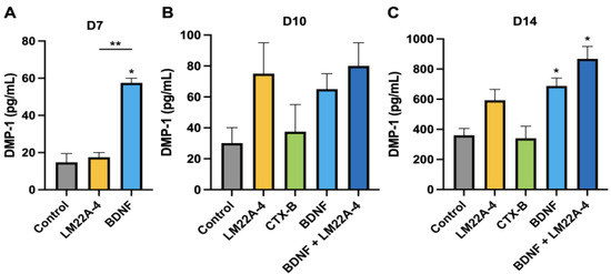 The regulation of the TrkB receptor affects the early to late stages of the odontogenic differentiation of DPSCs. A comparison of DMP-1 expression among several treatment groups at distinct time points. (A) Early-stage odontogenic DPSC differentiation analyzed via a DMP-1 ELISA assay; (B) mid-stage DMP-1 expression in DPSCs on day 10; (C) late-stage DMP-1 expression in DPSCs on day 14, showing significant increment in DMP-1 levels in the later stage of the odontoblastic differentiation of DPSCs. * p < 0.05 and ** p < 0.01 vs. control.