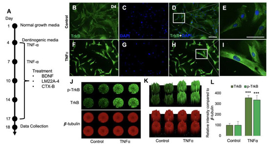 TNFα treatment increases TrkB and its phosphorylation in DPSCs. (A) Schematic TNFα treatment of the experiment during 17 days of odontoblastic DPSC differentiation. (B–I) Immunofluorescent image of TrkB receptors in DPSCs after TNFα treatment on day 4. (E,I) Magnified images of (D,H). (J) In-cell Western analysis of p-TrkB and TrkB treated by TNFα. beta tubulin was used as a housekeeping gene. (K) 2.5D model intensity analysis of in-cell Western assay. (L) The statistical analysis of in cell-Western data from (J,K). Scale bars: 50 μm. *** p < 0.001 vs. control.