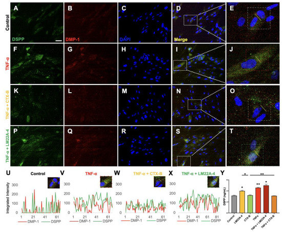 Immunostaining data show that TNFα increased the expressions of odontogenic markers such as DSPP and DMP-1 in DPSCs (Figure 7). Similarly, TNFα showed a significant induction of the concentration of DSPP (control: 3.15 ± 0.08 vs. TNFα 4.57 ± 0.10 p < 0.05) in DPSCs via an ELISA assay. The DSPP concentration was markedly induced (3.99 ± 0.16, p < 0.00) by LM22A-4 but was unchanged by CTX-B compared to the concentration of DSPP in untreated control DPSCs (Figure 7Y). Co-stimulation with TNFα and LM22A-4 showed significantly increased expression levels of DSPP and DMP-1 in DPSCs (Figure 7X) compared to DPSCs treated with TNFα alone (Figure 7V), whereas treatment with both TNFα and CTX-B showed decreased expression levels of DSPP and DMP-1 (Figure 7W).