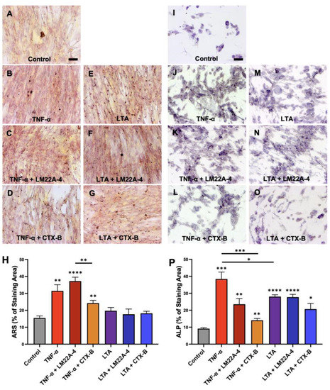 Figure 8 shows the increased mineralization activity of DPSCs via ARS (Figure 8A–H) and ALP (Figure 8I–P) treated with LTA or TNFα. A significant increase in the mineralization activity of DPSCs was observed in the ARS treated group with TNFα (31.46 ± 8.17, p < 0.01) compared to the untreated control (15.47 ± 2.71). It was also observed that the combined effect of TNFα and LM22A-4 was noticeably greater than the effect of TNFα treatment alone (control vs. TNFα + LM22A-4: 37.26 ± 5.12, p < 0.05). The results also showed that TNFα and LTA markedly induced alkaline phosphatase activity in the DPSCs which was significantly suppressed via the CTX-B treatment, indicating that TrkB regulates the mineralization stimulated by TNFα and LTA. However, TNFα treatment increased the mineralization activity by modulating TrkB, comparatively more than LTA. These results further confirm that inflammation-induced dentinogenesis is regulated via TrkB receptor.