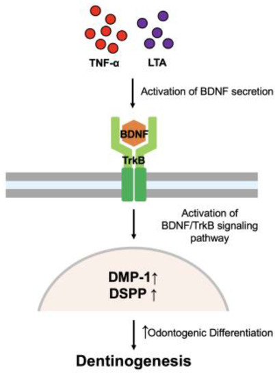 A summarized mechanism of the activation of TrkB receptor and BDNF expression during LTA- or TNFα-stimulated odontogenic DPSC differentiation.