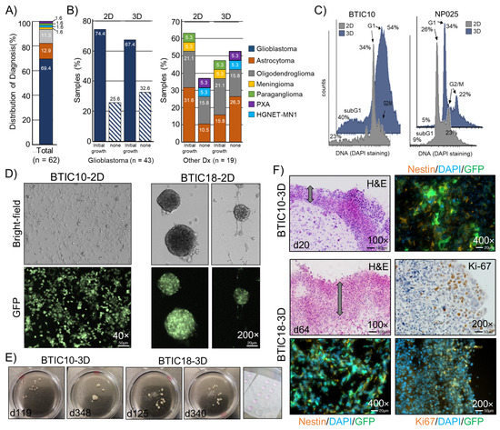 Establishment and characterization of patient-derived 3D cell culture models. (A) Distribution of diagnoses within the sample cohort in percent. (B) Samples with and without signs of growth for 2D and 3D cultures. Percent was calculated according to the total number of samples, glioblastoma (n = 43, left panel), and all other diagnoses (n = 19, right panel). (C) Representative histograms of the cell cycle analysis of two patient-derived GBM cell lines cultured in 2D and 3D. Percent cells are indicated. (D) Representative images of adherent or in suspension growing 2D cultures (passages 18 to 20). (E) 3D cultures shown at ~4 and ~12 months. Right image: Matrigel™ drops with mixed cells. (F) Images of H&E stained cryosections (8 μm) and sections stained for the stemness marker Nestin and the proliferation marker Ki-67 from areas of the cell dense edge region are shown, and constitutive GFP fluorescence is indicated. Nuclei counterstained with DAPI. The cell-rich outer layer is indicated by an arrow. Magnifications and scale bars are indicated.