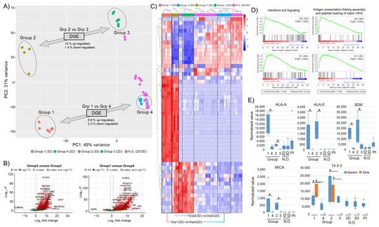 “Bulk” RNA sequencing of 2D and 3D cultured GBM models. (A) Principal component analysis of 11 GBM models. “Distinct” 3D (Group 1, Group 2) and corresponding 2D (Group 3, Group 4) samples are highlighted. Percent of differentially regulated genes of the groups are indicated. “Non-Distinct” (N.D.) 2D and 3D models are indicated. (B) Volcano plot of differentially regulated genes (2D versus 3D) with a log fold change >5 and p-value < 0.05. (C) Heat map of the top 50 most variable genes. Corresponding cultures are labeled 3D (solid box) and 2D (dotted line). (D) GSEA with enrichment plots for “Interferon α/β” (R-HSA-909733) signaling and “Antigen presentation, folding assembly and peptide loading of class I MHC” (R-HSA-983170) pathways using the Reactome Pathway Database (FDR score < 25%). (E) Normalized expression values for selected MHC class surface receptor genes (HLA-A, HLA-E), B2M, and stress-signaling markers (MICA and 14-3-3ε/14-3-3ζ). Asterisks indicate significant differences with p-value < 0.05.