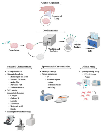 Representative scheme showing the study’s methodological pathway. The first step consisted of porcine ovaries acquisition. Then, the ovarian artery was cannulated, and the ovaries were perfused with deionized water, PBS, detergents, and ultrasonication to accomplish the decellularization. Once decellularized, the whole-organ scaffolds underwent structural, spectroscopic, and cellular assays to characterize the material composition, decellularization protocol efficiency, and the scaffold’s biological properties related to cell anchorage, survival, and proliferation. Created with BioRender.com.