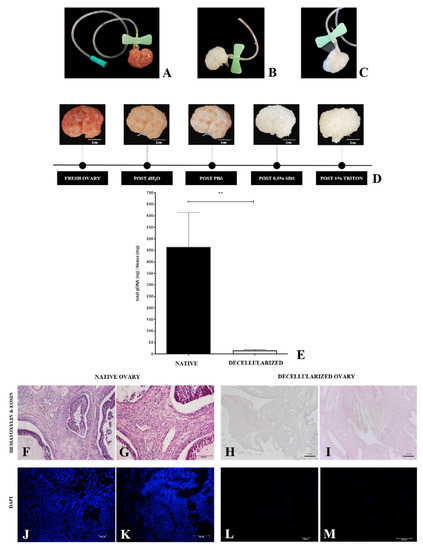 Whole-ovary perfusion decellularization efficiency evaluation. Cannulated ovary through the ovarian artery (A). Decellularized whole ovary (B). Decellularized whole ovary with ruptured follicles (C). Macroscopic aspect of perfusion ovaries, highlighting the progressive whitening (D). DNA quantification (E) and histological evaluation (H&E and DAPI staining) of samples undergone perfusion decellularization (H,I,L,M) compared to native samples (F,G,J,K). ** p < 0.05 compared to the native tissue.