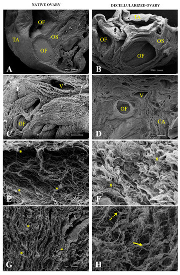 Representative scanning electron micrographs of ovarian native (A,C,E,G) and decellularized tissue (B,D,F,H). OF (ovarian follicle), TA (tunica albuginea), OS (ovarian stroma), V (vessel), CA (collagen arrangement). Yellow asterisk indicates cell presence among ECM fibers. Yellow “x” indicates collagen fiber bundles without cells. Full yellow arrows indicate thick fibers. Dotted arrows indicate thin fibers.