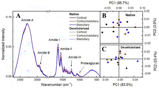 FTIR-ATR spectrum of cortical, corticomedullary, and medullary regions of the porcine ovary (A). PCA scores plots of native (B) and decellularized (C) samples.