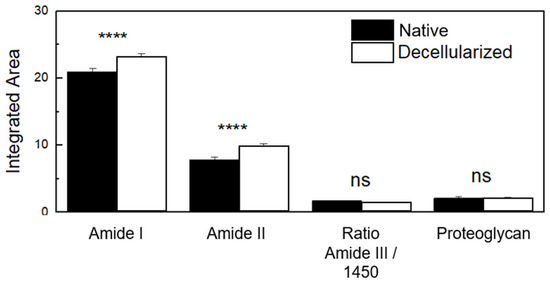 Amide regions can be associated with organs with high collagen content, with amide I serving as a spectral marker for protein secondary structure. Amide II can be related to protein hydration but also can indicate collagen self-assembly, which consists of a spontaneous aggregation of several scales of collagen molecules to form staggered longitudinal matrices [47,51]. The triple helical structure of collagen can be evaluated by means of the ratio of amide III to 1450 cm−1 (CH2 deformation) [47]. C–O–C and C–OH bonds are associated with proteoglycan content, which is composed mostly of sulfated glycosaminoglycans (GAGs) bound covalently to a protein core [47,52]. Based on these spectra screening results, to evaluate the content of compounds and protein structures before and after the decellularization process, band areas of amides I, II, and proteoglycan were obtained by integration, and the ratio of amide III: 1450 cm−1 was calculated as shown in Figure 8. There was no statistically significant difference in the proteoglycan content and collagen’s triple helical structures between the native and decellularized samples. Regarding the collagen content, decellularized samples presented a percentual variation of 11% for amide I and 27% for amide II. This variation is not related to an increase in collagen content, but due to the cell removal, collagen fibers probably self-assembled, enhancing the spectral intensity of collagen molecular components.