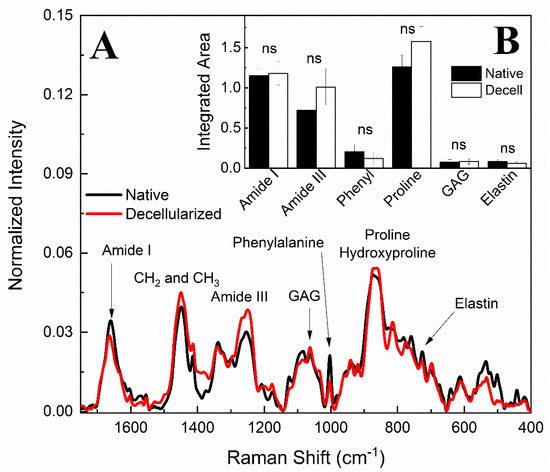 In addition to FTIR results, Raman spectroscopy analysis was also applied to evaluate ECM physico-chemical alterations in both native and decellularized tissues. Raman spectra before and after the decellularization process (Figure 9A) exhibited bands associated with the amide I band at 1660 cm−1, the amide III band between 1288 and 1218 cm−1 [52,53,54,55,56,57], and the vibrations of CH2 and CH3 molecules [55] centered on a band at 1450 cm−1. S=O symmetrical stretching at 1062 cm−1 can be attributed to GAG molecules and the ring stretching vibration mode of phenylalanine at 1003 cm−1 [53,54,57,58,59,60]. The overlapping bands at 856 and 875 cm−1 can be associated with the presence of C–C stretches present in the proline and hydroxyproline ring residues [54,55,56,57,58]. The elastin can be characterized at 725 cm−1 [55,58]. Raman band areas of amide I, amide II, phenylalanine, proline, GAGs, and elastin were calculated by integration to compare their contributions before and after the decellularization process, as shown in Figure 9B. It is consistent with the FTIR-ATR results that ECM compounds did not present a statistically significant variation. Therefore, it is possible to infer that no variations were detected in the extracellular matrix components after the decellularization protocol.