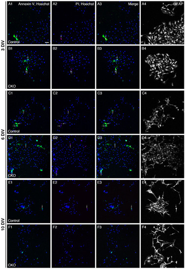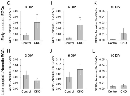 Next, for analysis of survival, primary cultures of the myenteric plexus from the small intestine of control and CNB1-CKO mice were stained with Annexin V-FITC, PI, and Hoechst 33342 as a cell death assay at 3, 6, and 10 DIV (Figure 2A–F). After fluorescent images were acquired, they were fixed and processed for immunocytochemistry against GFAP, and the same optical fields were imaged again. Ratios of early apoptotic EGCs (GFAP+, Annexin V+, PI- cells to GFAP+ cells) and late apoptotic/necrotic EGCs (GFAP+, Annexin V+, PI+ cells to GFAP+ cells) were calculated (Figure 2G–L). Hoechst 33342 stains the nucleus of all of live and dead cells. As a result, ratios of early apoptotic EGCs were significantly higher in CNB1-deficient EGCs than in control EGCs at 3 and 6 DIV, showing that early apoptosis of CNB1-deficient EGCs was increased in the early and middle culture period compared with control EGCs.