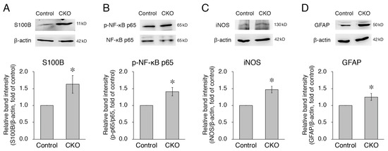 3.3. Increased Expression of S100B, iNOS, and GFAP and Phosphorylation of NF-κB p65 in CNB1-Deficient EGCs
