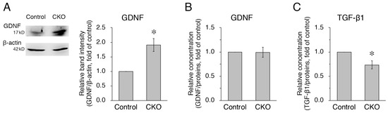 Next, we examined GDNF and TGF-β1 as other substances secreted from EGCs. GDNF [24,25,26] and TGF-β1 [27,28,29] enhance intestinal epithelial barrier maturation and wound healing via the regulation of proliferation and differentiation and the upregulation of intercellular junctional proteins in epithelial cells. In addition, GDNF [24,30] and TGF-β1 [27,31,32] have anti-apoptotic and restitution effects in epithelial cells, respectively. Western blot analysis showed that expression of GDNF was increased in purified EGC cultures from the CKO mice compared with control mice (Figure 4A). However, ELISA using the supernatants of purified EGC cultures showed that GDNF secretion was not altered in CNB1-deficient EGCs compared with control EGCs (Figure 4B). In contrast, TGF-β1 secretion was reduced in CNB1-deficient EGCs compared with control EGCs (Figure 4C).