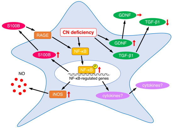 Because S100B activates the NF-κB pathway through its receptor RAGE [12], increased expression and secretion of S100B would lead to NF-κB activation in CNB1-deficient EGCs. The result that NF-κB p65 phosphorylation was increased is consistent with this. NF-κB activation would result in increased production of various inflammatory cytokines such as tumor necrosis factor-α, interleukin-1, interleukin-6, and cyclooxygenase-2 downstream of the NF-κB pathway (Figure 6), although these changes remain to be elucidated. Analyses of these changes are one of the important issues for a future study.