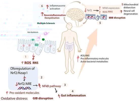 Redox signaling pathways involved in GIB/BBB integrity and inflammasome activation in MS. Gut dysbiosis, irrespective of its cause, leads to: (1) increased ROS/RNS concentration; (2) dysregulation of the Nrf2/Keap1 protective pathway; (3) decreased expression of Nrf2/ARE transcription factors, which leads to activation of the NFkB pathway, in turn promoting gut inflammation and leading to GIB disruption; (4) GIB disruption increases the permeability to small active compounds released by gut bacteria and makes it easier for bacteria to invade by lowering the local immune defense; (5) active gut microbiota metabolites trigger the BBB disruption and increase ROS/RNS and pro-inflammatory molecule levels through inhibition of Nrf2; and (6) increased ROS levels in the brain induce mitochondrial disfunction and inflammasome activation.