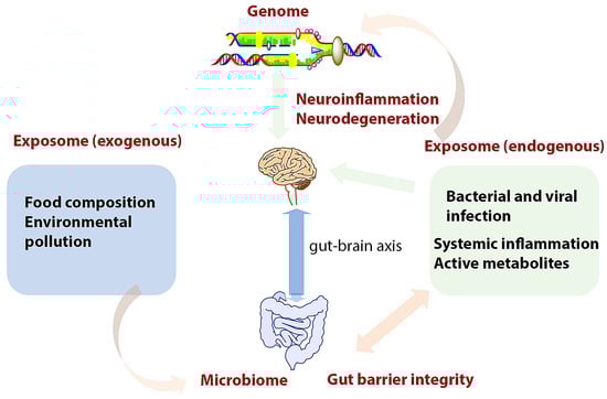Complex interrelationships involved in GIB/BBB integrity, inflammation, and neurodegeneration that need to be included in MS management and therapy. Exogenous exposomes interact with gut microbiota and modulate the gut microbiome; this interaction can be either protective or damaging to microbiome composition and GIB. The intestinal disbalance triggers neuroinflammation and neurodegeneration via the endogenous exposome and the gut–brain axis. These biological processes are conditioned by host genome.
