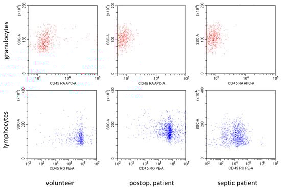 Representative flow cytometry diagrams demonstrating the expression of CD45RA in granulocytes and the expression of CD45RO in lymphocytes in volunteers, postoperative patients, and patients with sepsis. Expression of both subtypes was markedly reduced in patients with sepsis.