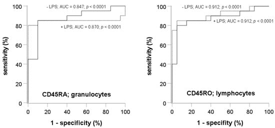 The marked changes in CD45RA in granulocytes and CD45RO in lymphocytes suggested that these surface markers might serve as biomarkers for the diagnosis of sepsis. To further evaluate the diagnostic value, we calculated the receiver operating characteristic curves. The results, shown in Figure 6, reveal a good discrimination with both CD45RA and CD45RO in both the absence and presence of LPS. The area under curve was in the range between 0.847 and 0.912, and the asymptotic significance level was always p < 0.0001.