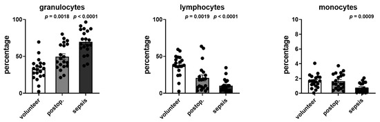 Distribution of granulocytes, lymphocytes, and monocytes in volunteers, postoperative patients, and patients with sepsis. Data are given as the percentage of the respective leucocyte subtype to all subtypes (100%) as gated with flow cytometry. p-values denote Bonferroni corrected t-test results as the post hoc test performed subsequent to a significant ANOVA result.