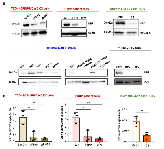 The following supporting information can be downloaded at: https://www.mdpi.com/article/10.3390/cells12141877/s1, Figure S1: Plasmids used in the study; Figure S2: Analysis of KO/KD; Figure S3: Quantification of western blot analysis of UBF expression; Figure S4: Affected TFIIH abundance and impaired ribosomal biogenesis in TTDN1 and RNF113A mutant cells; Table S1: Cell lines used in the study; Table S2: Cell lines used in the study; Table S3: Sequences (5′ to 3′) of primers used to amplify rDNA regions; Table S4: Antibodies used for western blots in the study; Table S5. Antibodies used for immunofluorescence staining in the study. References [6,52,53,54,55,56,57,58,59,60] are cited in Supplementary Materials.