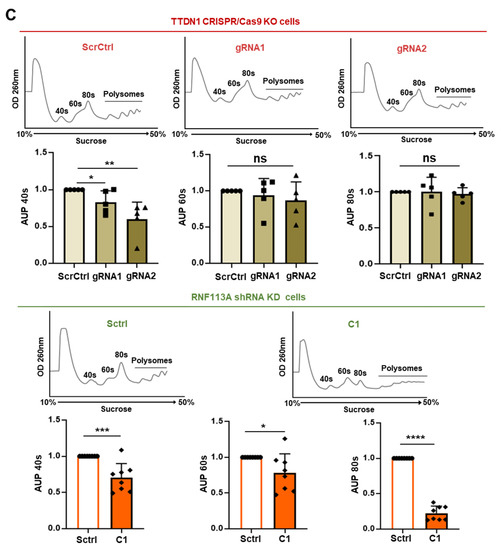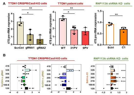 3.3. rRNA Transcription and Ribosomal Subunits Are Differentially Affected in the TTDN1 Knockout and RNF113A Knockdown Cells