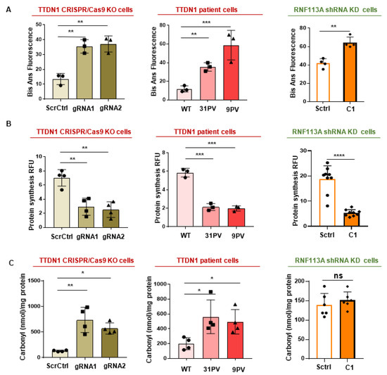 Next, we were asking for the cellular outcomes of the hitherto described aberrations and investigated the stability of the proteome against unfolding, a parameter that distinguishes long-living from short living sea shells [26], and it was found to be reduced in Cockayne syndrome and other forms of TTD [11,23]. Cytoplasmic extracts were incubated with 2M urea, that partially unfolds the proteome, and the amount of exposed hydrophobic side chains were quantified by BisAns fluorescence. This method revealed a strong elevation of misfolded protein in the proteome of the manipulated cells (Figure 5A), suggesting that a significant proportion of the proteome might be affected by random amino acid exchanges, de-stabilizing the folding stability. Total protein synthesis was investigated by the use of a protein synthesis detection kit (Cayman). This method employs O-propargyl-puromycin (OPP) that is incorporated in the growing amino acid chain and leads to a stop of translation. The labeled products were then quantified by click-chemistry and indicate the amount of translation initiation. This process is found to be severely reduced by the manipulation of the TTDN1 gene or RNF113A expression (Figure 5B), suggesting that an error-prone protein synthesis process and the production of misfolded proteins could impact on the translation rate of novel proteins. Finally, we asked if we find, as in other forms of TTD, signs of protein oxidation in the manipulated cells. Measuring protein carbonylation—a consequence of translational errors [27]—unraveled elevated carbonylation in TTDN1 knockout/patient cells, but not in the RNF113A knockdown strain (Figure 5C). Taken together, these results demonstrate that the homeostasis of the proteins in TTD-like cells is severely affected in accordance with recent publications, demonstrating a loss of proteostasis in other forms of TTD.