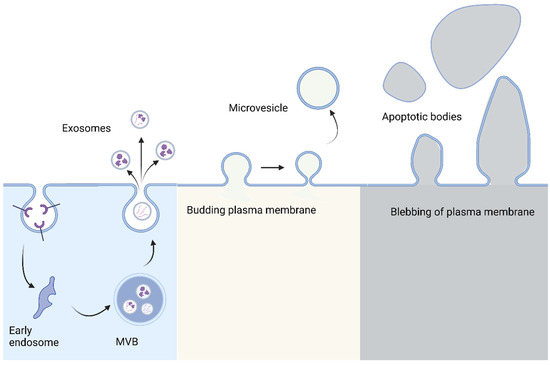 Biogenesis of different types of EVs. Exosomes are produced when the cell membrane buds inwards and creates an endosome. Exosomes are formed from internal budding of the endosome and multivesicular bodies (MVBs). Once the MVB docks to the membrane, the exosomes are released through exocytosis. Microvesicles and apoptotic bodies are formed from budding and blebbing of the plasma membrane, respectively, before being released from the membrane. Apoptotic bodies are the remnants of cells having undergone apoptosis, or programmed cell death.