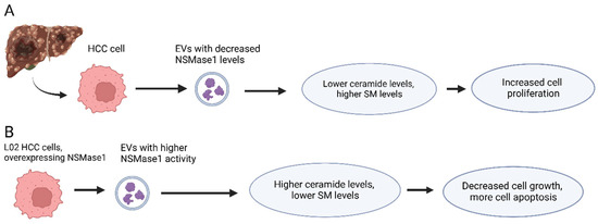 Effects of NSMase1 level in extracellular vesicles released from HCC Cells. (A) HCC cells in patients frequently produce extracellular vesicles with decreased NSMase1 level, leading to lower ceramide levels and higher sphingomyelin levels which result in increased HCC cell proliferation. (B) When HCC cells overexpress NSMase1 their extracellular vesicles have higher NSMase activity leading to higher ceramide levels and lower sphingomyelin leading to a decrease in HCC cell growth and increased apoptosis.