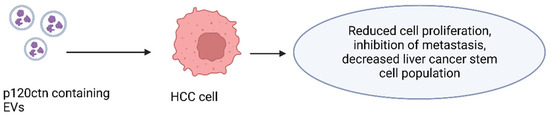The expression pattern of p120ctn is abnormal in many human tumors [32,33]. p120ctn is absent or altered in most human tumors, and its derangement is often correlated with a poor prognosis. p120ctn can act as a proto-oncogene or as an invasion suppressor. Loss of p120ctn results in decreased E-cadherin levels. E-cadherin is frequently down-regulated in epithelial cancers, in which it acts as a tumor suppressor [34,35,36]. Cheng et al. reported that p120ctn incorporated into EVs, secreted by liver cancer cells, inhibits the proliferation and metastasis of hepatoma cells and the expansion of liver cancer stem cells (Figure 3) [37]. The EV-transmitted p120ctn has also been found to thwart HCC progression by inhibiting the STAT3 pathway, suggesting that p120ctn-containing EVs derived from cancer cells may be used as a therapeutic agent to treat liver cancer [37].
