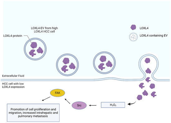 Lysyl oxidase (LOX), a copper-containing amine oxidase, is a member of a heterogeneous family of enzymes that oxidize primary amine substrates to reactive aldehydes. The enzyme is known for its function of extracellular catalysis to form lysine-derived cross links in fibrillar collagens and elastins. Lysyl oxidases have been found to contribute to a spectrum of biological functions such as developmental regulation, tumor suppression, cell motility, and cellular senescence. LOX can be found in intracellular and intranuclear locations. Other LOX functions such as a potential role in cell adhesion and cell growth control can be determined by the conserved domains of LOX, such as the cytokine receptor-like domain that is shared by all LOXs and by multiple scavenger receptor cysteine-rich (SRCR) domains present in LOX-like 2 (LOXL2), 3 (LOXL3), and 4 (LOXL4) [43]. Furthermore, these functions may be carried out in a temporally and spatially regulated fashion [43]. LOXL4 is known to be upregulated in HCC tumor tissues and such upregulation is associated with a poor prognosis for HCC patients. LOXL4 has even been shown to play an important role in hepatocarcinogenesis by creating a microenvironment that is immunosuppressed during tumor development [44]. In vitro, LOXL4 knockdown inhibits HCC cell migration and invasion, and its upregulation in vivo promotes intrahepatic and pulmonary metastasis of HCC [45]. Interestingly, LOXL4 is present in the cargo of HCC-secreted EVs, and HCC cells that have lower expression levels of LOXL4 are targeted by the EVs secreted by HCC cells with higher LOXL4 expression (LOXL4-EVs) [45]. These LOXL4-EVs transfer LOXL4 to the HCC cells with lower expression levels of LOXL4 and promote migration of the cells by activating the FAK/Src pathway via its amine oxidase activity through the hydrogen peroxide-mediated mechanism (Figure 4) [45]. These LOXL4-EVs also transfer LOXL4 to human umbilical vein endothelial cells to promote angiogenesis via the paracrine mechanism [45].