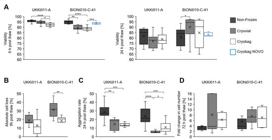 Viability, cell loss, aggregation rate, and fold change for UKKi011-A and BIONi010-C-41 after thawing in comparison to the non-frozen control. (A) Viability 0 and 24 h post-thaw of cells frozen in cryo vial (grey) and cryo bag (white) compared to the non-frozen control (black). In the scope of a two-centre study, Novo Nordisk provided viability results of cells frozen in cryo bag (blue). (B) Absolute cell loss 0 h post-thaw comparing cryo vial and cryo bag. (C) Aggregation rate 24 h post-thaw of non-frozen cells compared to cells frozen in cryo vial or cryo bag. (D) The fold change in cell number was calculated at 72 h post-thaw. The values were normalised to the cell number after 24 h after inoculation. Statistical significance was determined using a Student’s t-test (* p < 0.05; ** p < 0.01; *** p < 0.001; **** p < 0.0001).