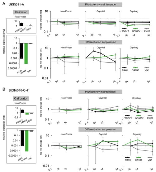 We show that the original cell fate of both cell lines is not altered by an increased cell density and volume during cryopreservation. The hiPSCs maintain their stemness characteristics and meet the applied EBiSC quality-control criteria, proven by mRNA and protein expression. FCM and qRT-PCR data show no significant changes during cryopreservation and a cultivation period in suspension for 3 days, which figure among the approaches (non-frozen, frozen in cryo vials, and frozen in cryo bags) taken in a dual-centre study at Fraunhofer IBMT in Germany (production and evaluation site for UKKi011-A and BIONi010-C-41 in biological and technical triplicates) and Novo Nordisk in Denmark (evaluation site for UKKi011-A in technical triplicates). Additionally, the hiPSC lines were checked for differentiation suppression using the markers PAX6, GATA6, and VIM. While the UKKi011-A remained unsuspicious after 3 days of culture upon bulk-freezing at both sites (outliers post-thawing for PAX6 in vials), BIONi010-C-41 showed an increase in VIM expression and a decrease in PAX6 expression at Novo Nordisk. Results at Fraunhofer IBMT cannot confirm these findings, unlike the rest of the data. Thus, either the shipping process or minor differences in handling during and after thawing may have caused this aberration. That shows how cautiously hiPSCs need to be processed and handled, especially regarding a potential clinical application. The increased expression of VIM is most likely a stress response, unrelated to differentiation []. And as the BIONi010-C-41 is edited to ease neural differentiation, the genetic background might favour mesodermal fate.