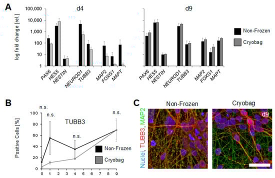 DOX-induced neural differentiation of BIONi010-C-41 after bulk cryopreservation. (A) qRT-PCR analysis of the BIONi010-C-41 along the differentiation after DOX induction into mature neurons. The ectoderm-specific markers PAX6, HES5 and NESTIN, the markers for immature neurons NEUROD1 and TUBB3. For mature neurons, MAP2, FOXG1, and MAPT were used as indicators of neural fate. In cryopreserved cells, a delayed expression of neural markers was observed, but at the end of differentiation, gene expression was comparable to the non-frozen control. (B) In a FACS analysis, the marker of immature neurons TUBB3 was examined on the protein level, indicating an increase during the cultivation in both conditions. Statistical analysis was performed using a Student’s t-test (n.s. = not significant). (C) Representative fluorescence microscopy images of neurons after 9 days of cultivation verify the expression and the location of immature neuron marker TUBB3 and mature neuron marker MAP2. Scale bars indicate 50 µm.