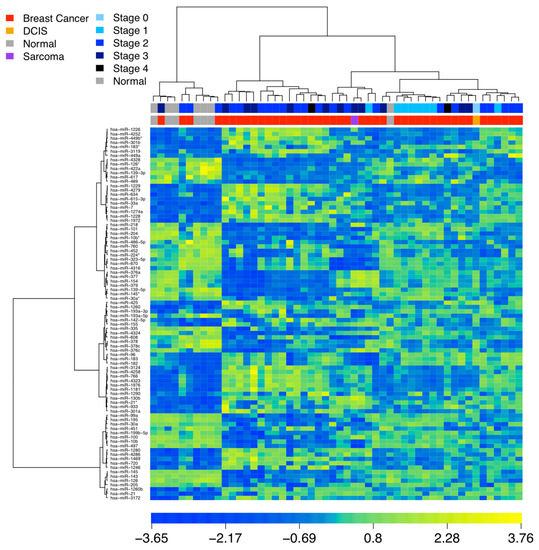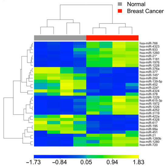Among the analyzed miRNA markers, a subset of six markers exhibited concordant differential expression between breast cancer vs. normal in both tissues and blood samples. Utilizing these six markers, the breast cancer and normal blood samples could be effectively distinguished with an overall classification accuracy of 100%, as illustrated by the heatmap depicted in Figure 3. This finding further underscored the potential of these markers in accurately discriminating between breast cancer and normal patient samples using minimally invasive blood tests. Detailed fold change information in blood samples was provided in Supplementary File S1.