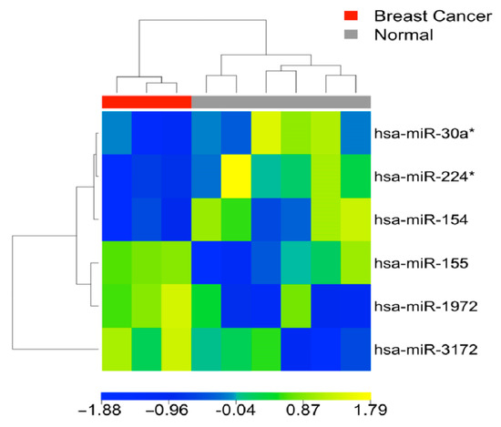 Heatmap of blood samples showing clustering analysis of six miRNAs concordantly expressed between breast cancer and normal samples in tissues and blood (FDR < 0.05 in SAM, p < 0.05 in unpaired t-tests). Blood samples from breast cancer patients (n = 3) can distinctly separate from those from normal individuals (n = 6).