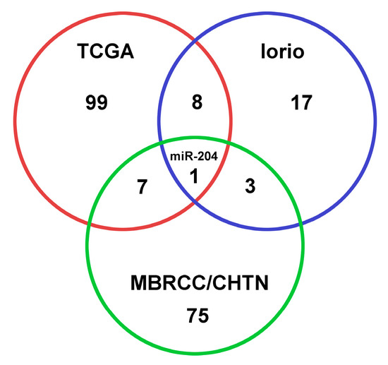 Venn diagram of selected miRNAs (isoform-specific) across different patient cohorts. The miRNA selection in the Iorio cohort and the MBRCC/CHTN breast cancer cohort was based on the statistically significant differential expression observed between breast cancer tumors and normal breast tissue samples. In TCGA, miRNA expression association with breast cancer progression was indicated with a hazard ratio (HR). HR > 1: survival hazard miRNA; HR < 1: survival protective miRNA. Detailed information was provided in supplementary file S1.