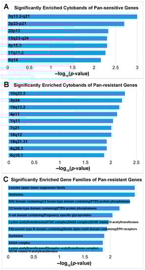 Significantly enriched cytobands and gene families of pan-sensitive and pan-resistant genes. (A) The –log10(p-value) of the significantly enriched cytobands of the pan-sensitive genes. (B) The –log10(p-value) of the top 10 significantly enriched cytobands of the pan-resistant genes. (C) The –log10(p-value) of the top 10 significantly enriched gene families of the pan-resistant genes. Details were provided in supplementary file S3.