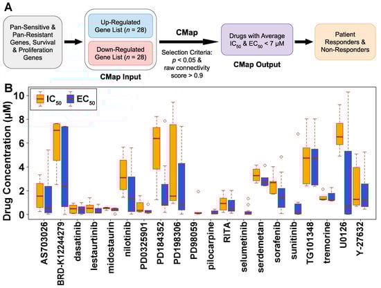 We input the selected 28 up-regulated genes and the 28 down-regulated genes into CMap. From the CMap output, we selected significant (raw connectivity score > 0.9, p < 0.05) pathways and compound sets as heuristic therapeutic targets. We further examined the half-maximal inhibitory concentration (IC50) and half-maximal effective concentration (EC50) of the significant compounds in the PRISM dataset, which led to the identification of 20 potential new or repurposed drugs with available IC50/EC50 measurements in the PRISM dataset. Our pipeline for repositioning drug discovery was shown in Figure 7A. Figure 7B displayed the boxplots of IC50/EC50 values of our discovered drugs in BRCA cell lines. Some of the drugs contained some outliers with extremely large values. The outliers were removed from the analysis and were not shown in the plot. These drugs belonged to 11 compound sets. In addition, three pathways were identified in shRNA knockdown experiments in breast adenocarcinoma MCF7 cells that matched our CMap input 56-gene expression signature (connectivity score > 0.9, p < 0.05), including knockdown of heat shock 70 (Hsp70) proteins (KD_HEAT_SHOCK_70KDA_PROTEINS:MCF7:TRT_SH.CGS) including HYOU1, HSPA5, HSPA9, and HSPA14 genes, SOD pathway (BIOCARTA_SODD_PATHWAY:MCF7:TRT_SH.CGS) including BAG4, BIRC3, CASP8, FADD, RIPK1, TNF, TNFRSF1A, TNFRSF1B, TRADD, and TRAF2, and knockdown of A-Kinase-Anchoring-Proteins (AKAPs; KD_A_KINASE_ANCHORING_PROTEINS:MCF7:TRT_SH.CGS) including AKAP9, AKAP13, and AKAP11. Details were provided in Supplementary File S3.
