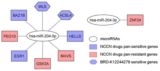 Hsa-miR-204 targeted genes. Among the hsa-miR-204-3p and hsa-miR-204-5p targeted genes, those pan-sensitive/pan-resistant to 19 NCCN breast cancer drugs and sensitive to BRD-K12244279 were shown.