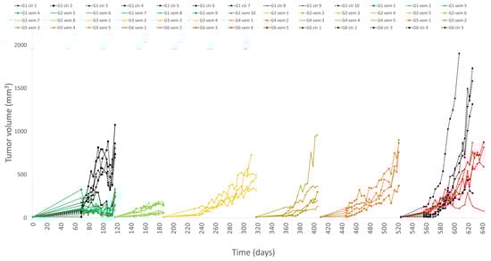 It is of importance that in the case of several markers, we observed considerable variability between different animals. This raises the importance of intertumoral [] and intratumoral [,] heterogeneity in terms of resistance development, which could occur parallel in different cell populations, as raised by other studies as well.