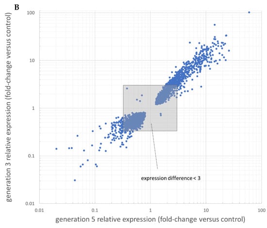 From each mouse, flash-frozen samples were prepared and used for genomic RNA generation. Based on tumor growth data, a total of nine samples were chosen from generations 1 (untreated), 3, and 5 (three animals from each group). The transcriptomic analysis by mRNAseq showed a clear grouping of biological groups in the primary component analysis, and provided a list of 3991 significantly differentially expressed genes in treated tumors (Figure 2), among which 434 genes were significantly altered both in short and long treatment groups.
