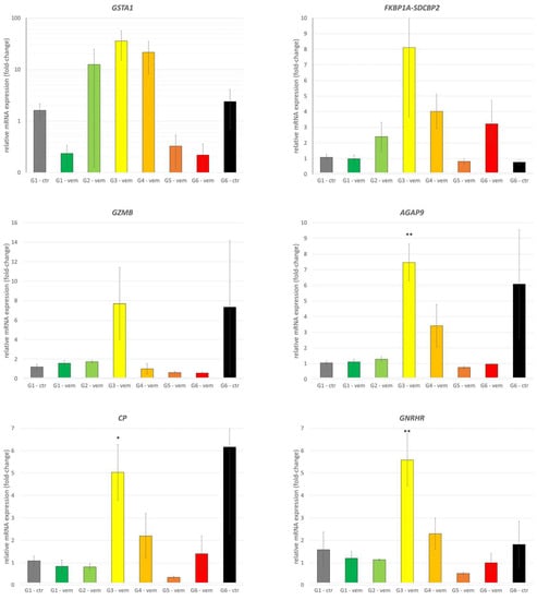 Relative mRNA expression changes of melanoma PDTX tissue upon vemurafenib treatment. All panels show relative expressions, normalized to control RPLP0. All measurements were analyzed in a common study to ensure the common threshold values for cT determination. Gene expressions (GSTA1, FKBP1A-SDCBP2, GZMB, AGAP9, CP, GNRHR) that share an expression peak in G3 samples but are not consistently changed. *: p < 0.05; **: p < 0.01.