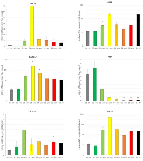 Relative mRNA expression changes of melanoma PDTX tissue upon vemurafenib treatment. All panels show relative expressions, normalized to control RPLP0. All measurements were analyzed in a common study to ensure the common threshold values for cT determination. Genes systematically upregulated (GPR39, CD27, SLC15A3, PDGFA, ABCB1) or downregulated (IFI27) after vemurafenib treatment. *: p < 0.05; **: p < 0.01.