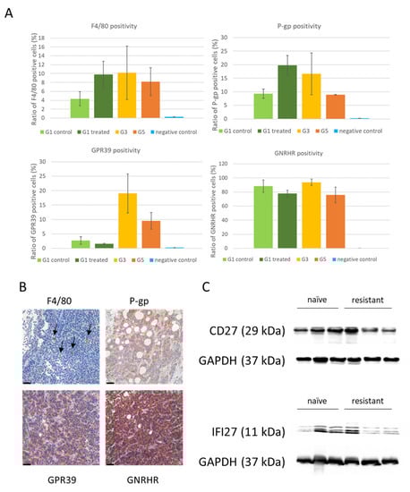 Two proteins unavailable for immunohistochemical analysis were subjected to Western blot: CD27 and IFI27 were both present in all treatment-naïve (G1) and resistant (G5) samples. However, in-group variance was high; therefore no significant changes could be proved (Figure 5C).