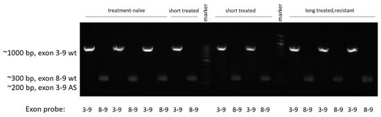 For the alternative splicing detection, we used reverse transcription, cDNA PCR, and gel electrophoresis to show products which are available only in the wild type (exon 8–9 probe) and both in wild type and exon 4–8 deleted forms but with different sized products (exon 3–9 probe). All 9 samples examined in the NGS analysis were found to carry full length BRAF only (Figure 6).
