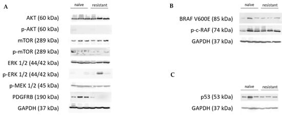 Protein levels and activation of different signaling pathway proteins, BRAF V600E, and activated CRAF, and p53 expression. The figure shows three parallel animals’ tumor samples from the treatment-naïve group and from generation 5. GAPDH was used as an endogenous control to ensure equal protein levels of every sample. (A) Neither AKT, mTOR, MAP2K1/2 (MEK 1/2), or P44/42 (ERK 1/2) was found to be systematically activated, though the ERK 1/2 expression was found elevated in one of the three resistant tumors. Moreover, PDGFRB, which showed a 4-times elevation in RNAseq data, was shown not to be overexpressed on the protein level. (B) BRAF V600E and p-c-RAF expressions remained unchanged on the vemurafenib treatment. (C) p53 accumulation is similar in both the naïve and resistant (and treated) samples.