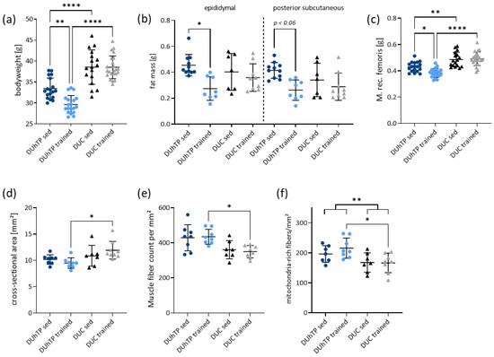 (a) Body weight (n ≥ 17), (b) epididymal (left panel, n ≥ 7) and posterior subcutaneous fat (right panel, n ≥ 7), and (c–f) detailed analysis of the muscle in trained and sedentary DUhTP and DUC mice at 70 days of age. (c) The dissected Musculus rectus femoris (Mrf) were weighted (n ≥ 17), and the (d) cross-sectional area (CSA, n ≥ 7), as well as (e) muscle fiber count and (f) mitochondria-rich fibers per mm2 analyzed muscle region (see Method part) were determined. The color used corresponds to the mouse groups (dark blue: DUhTP sed, light blue: DUhTP trained, black: DUC sed, gray: DUC trained). Data are presented as scatter plots with means and standard deviations. Statistical analysis was performed using two-way ANOVA. Significant differences are indicated: * p < 0.05, ** p < 0.01, **** p < 0.0001.